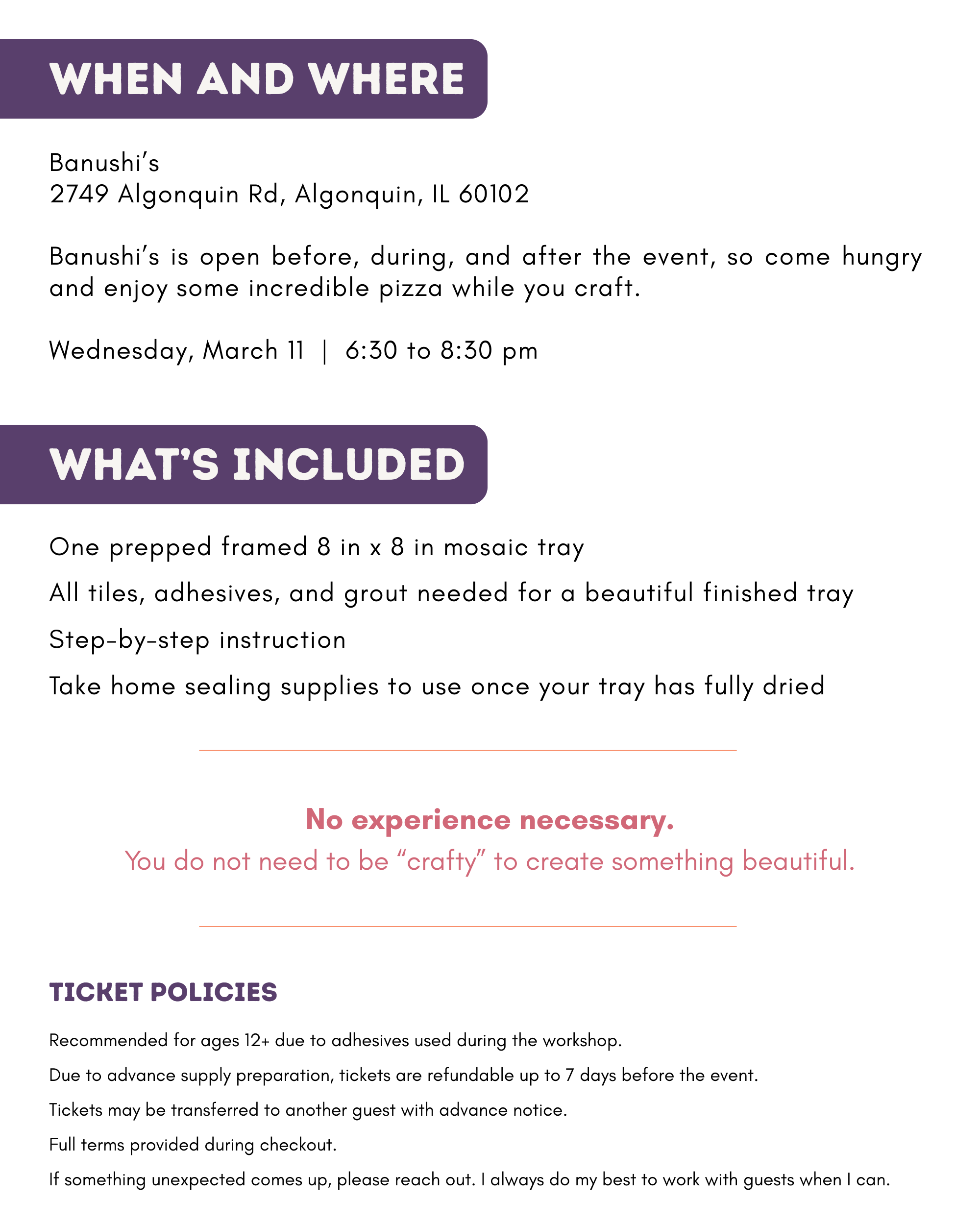 Join us for a relaxed and creative mosaic tray workshop at Banushi’s, Algonquin’s newest pizza spot. If you haven’t tried it yet, you are in for a treat, the food is delicious.